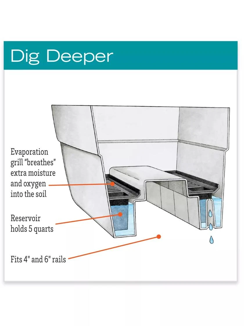 Now it’s easier than ever to have lush, colorful plants along a deck railing. This cleverly designed planter securely straddles rails made from both 4″ and 6″ milled lumber (actual width 3-1/2″ and 5-1/2″) — no mounting hardware needed. Best of all, it’s self-watering; simply fill the reservoir and plants receive water as they need it.